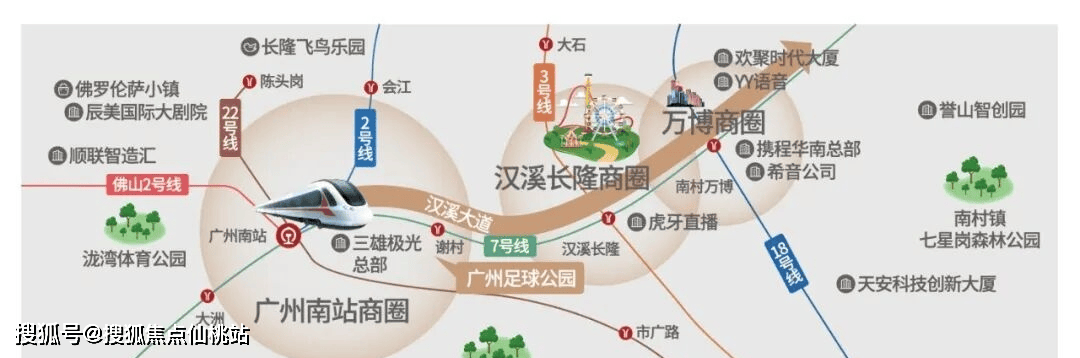 汉溪大道(正在建设中)将广州南站、长隆、万博等核心板块串联起来,聚焦万亿级产业集群,汇集了电商龙头希音、YY 语音、虎牙直播、小鹏汽车、三雄极光等 1700 多家高新企业。