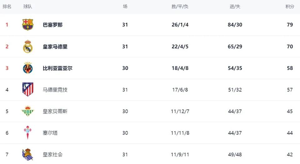 最后咱们来聊聊大家最关心的积分榜情况,经过第31轮的较量,积分榜格局再次发生了一些变化,但整体趋势没有太大变动。巴萨依旧遥遥领先,26胜1平4负,拿到79分,这样的积分优势,真的很难被超越。而皇马则被远远甩开,目前只拿到70分,落后巴萨9分,联赛争冠希望已经极其渺茫,估计皇马球迷现在心里都不好受吧。